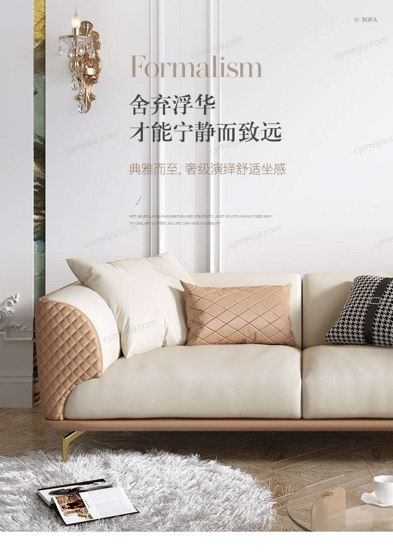 | 产品材质 : | 仿真皮+羽绒靠包/扶手+高密度海绵+俄罗斯落叶松实木框架+不锈钢镀金脚 |