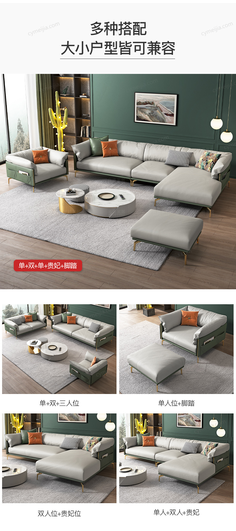 | 产品材质 : | 接触面进口头层黄牛皮+羽绒靠包/扶手+高密度海绵+俄罗斯落叶松全实木框架+不锈钢镀金脚 |