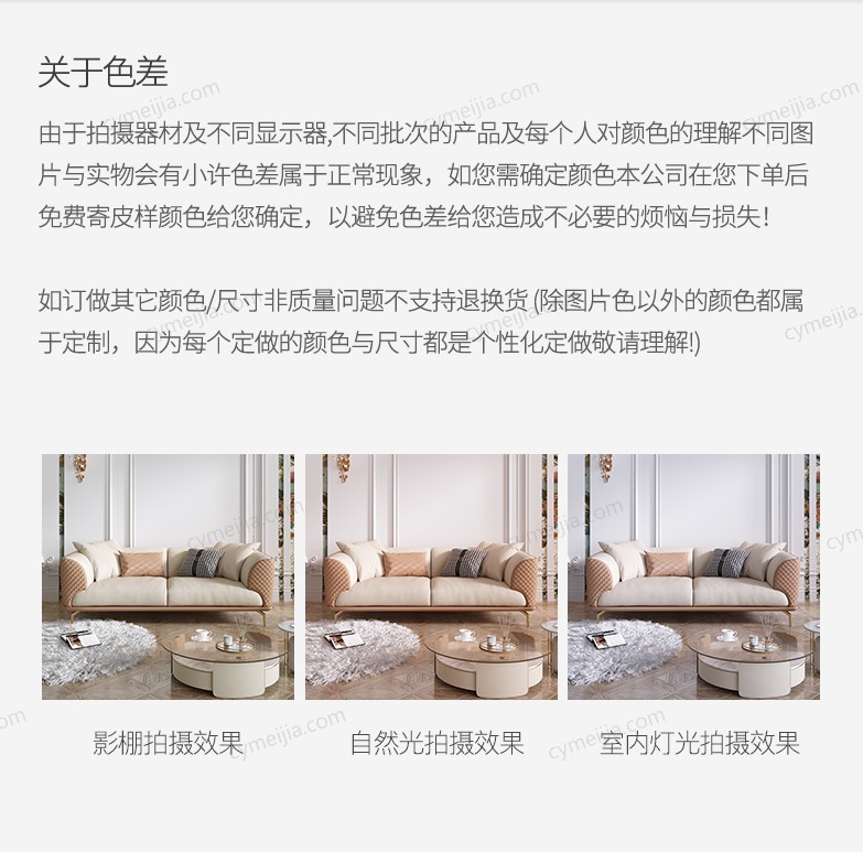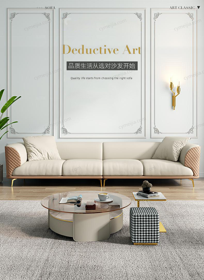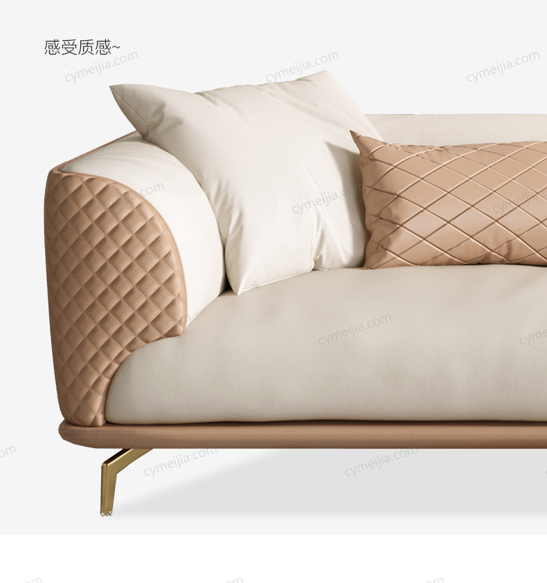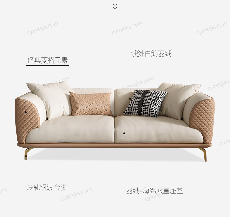 | 产品材质 : | 仿真皮+高密度海绵+俄罗斯落叶松实木框架+不锈钢镀金脚 |