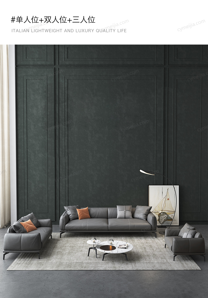 | 产品材质 : | 仿真皮+白鹅羽绒座包/靠枕+高密度海绵+俄罗斯落叶松实木框架+碳素钢脚 |
