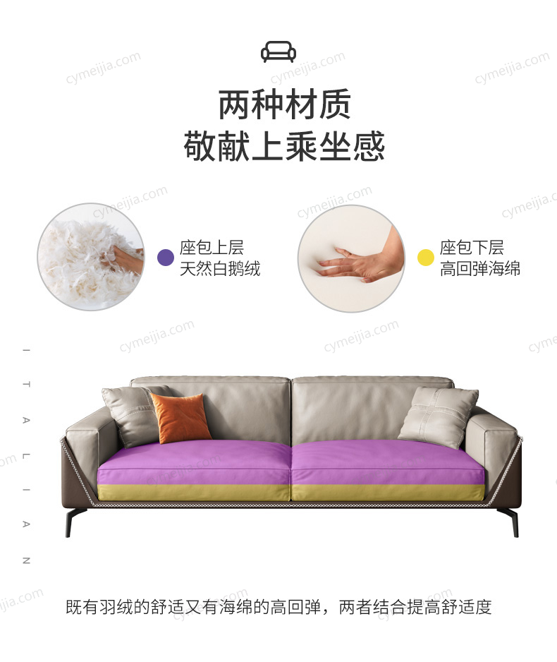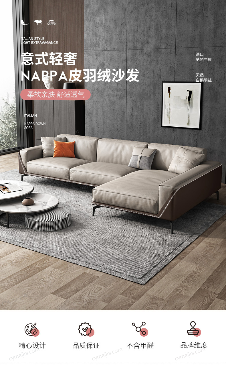 | 产品材质 : | 科技布+白鹅羽绒靠包+高密度海绵+俄罗斯落叶松实木框架+碳素钢脚 |