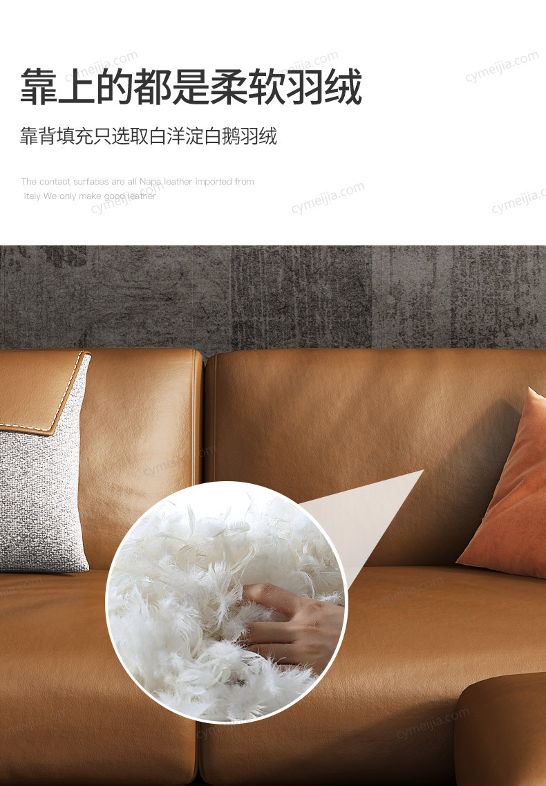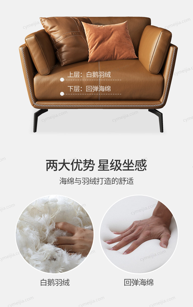 | 产品材质 : | 科技布+白鹅羽绒靠包+高密度海绵+俄罗斯落叶松实木框架+碳素钢脚 |