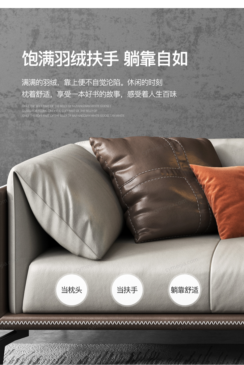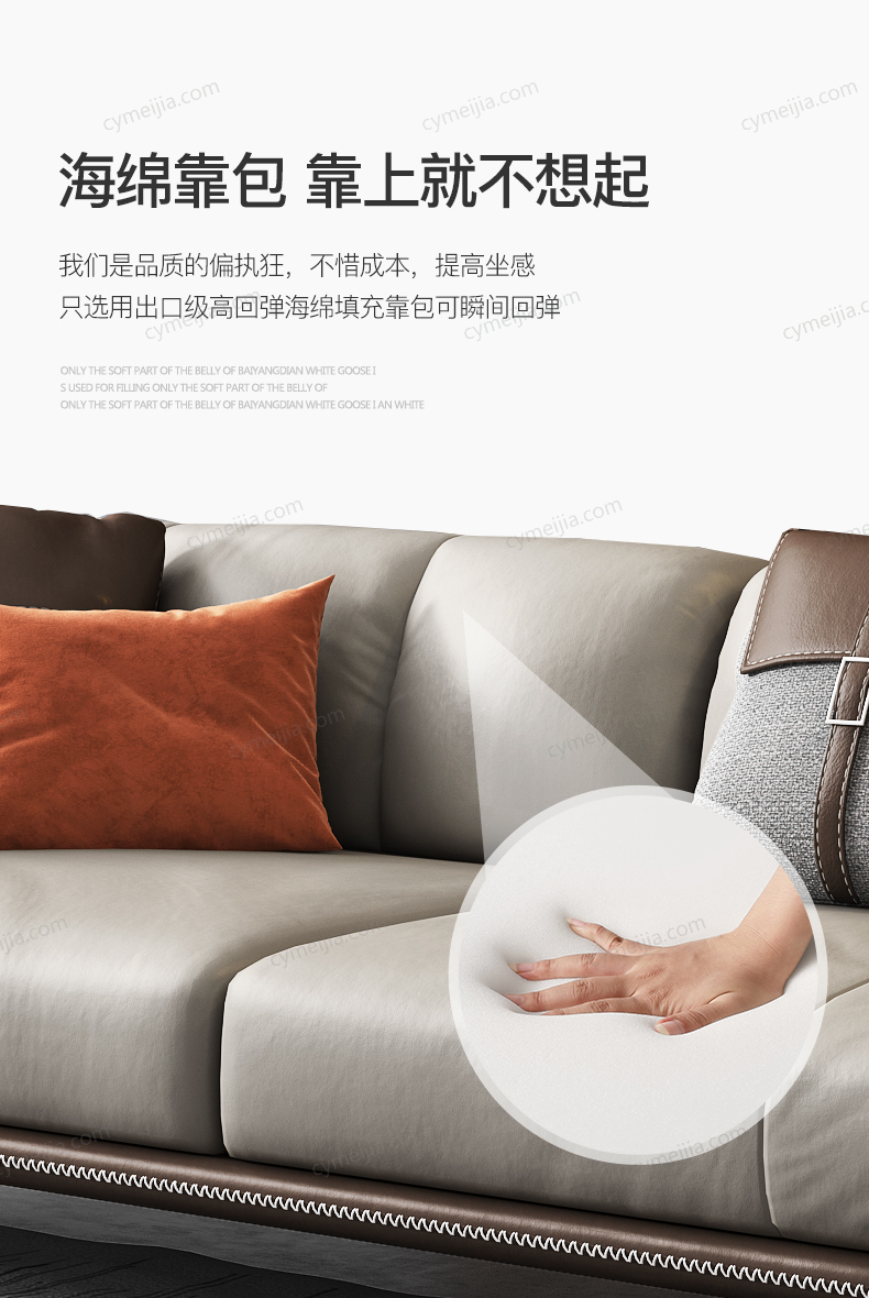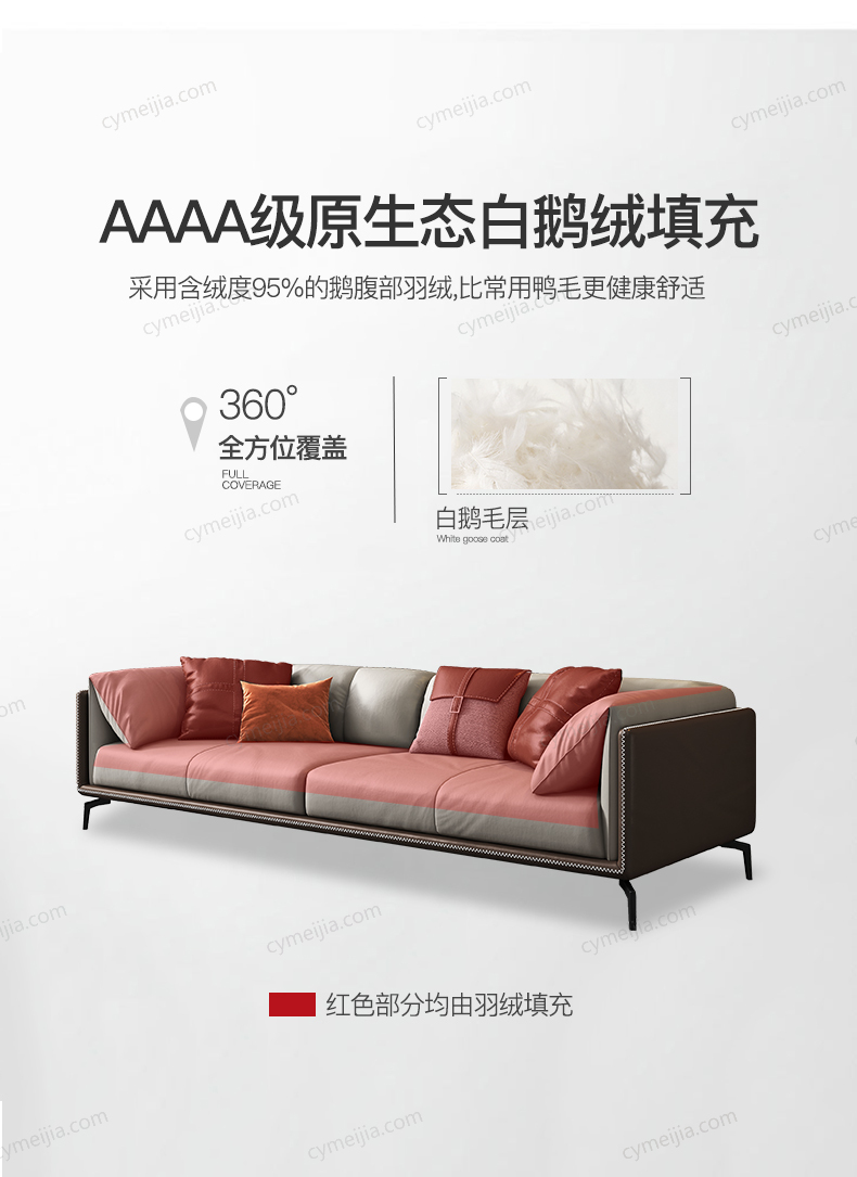 | 产品材质 : | 接触面进口头层黄牛皮+白鹅羽绒靠包+高密度海绵+俄罗斯落叶松实木框架+碳素钢脚 |