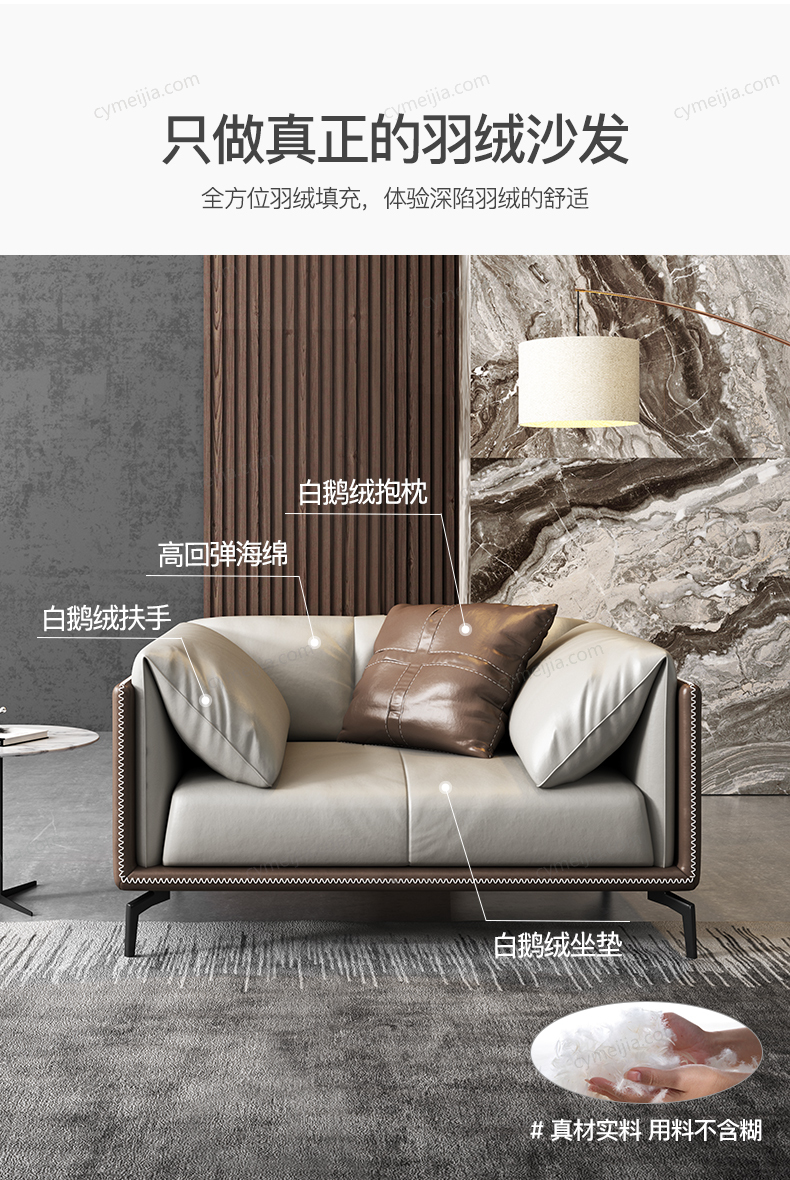 | 产品材质 : | 科技布+白鹅羽绒靠包+高密度海绵+俄罗斯落叶松实木框架+碳素钢脚 |