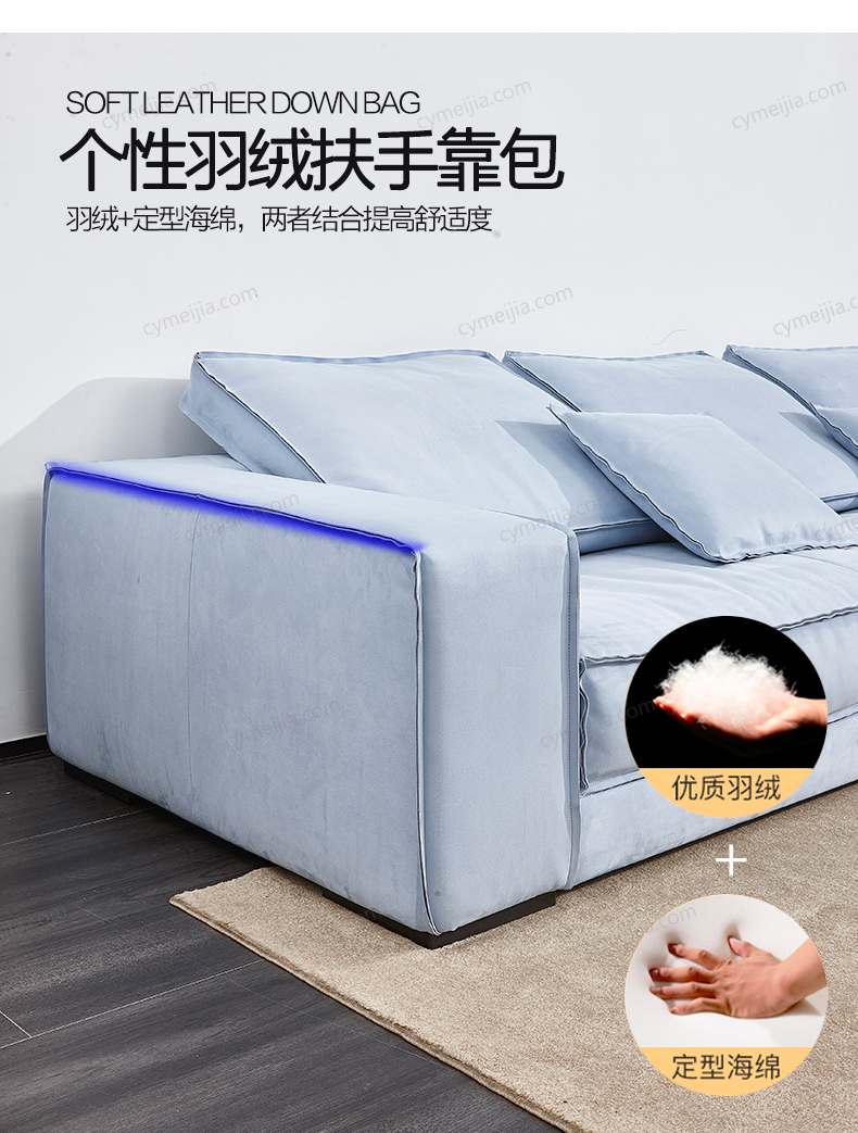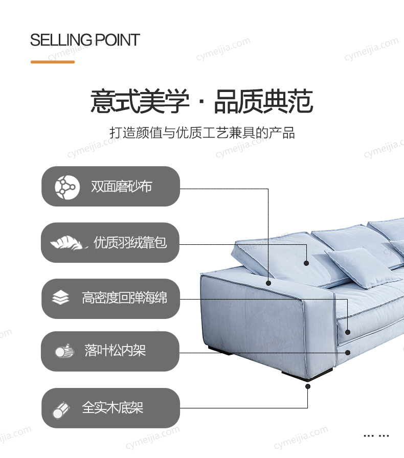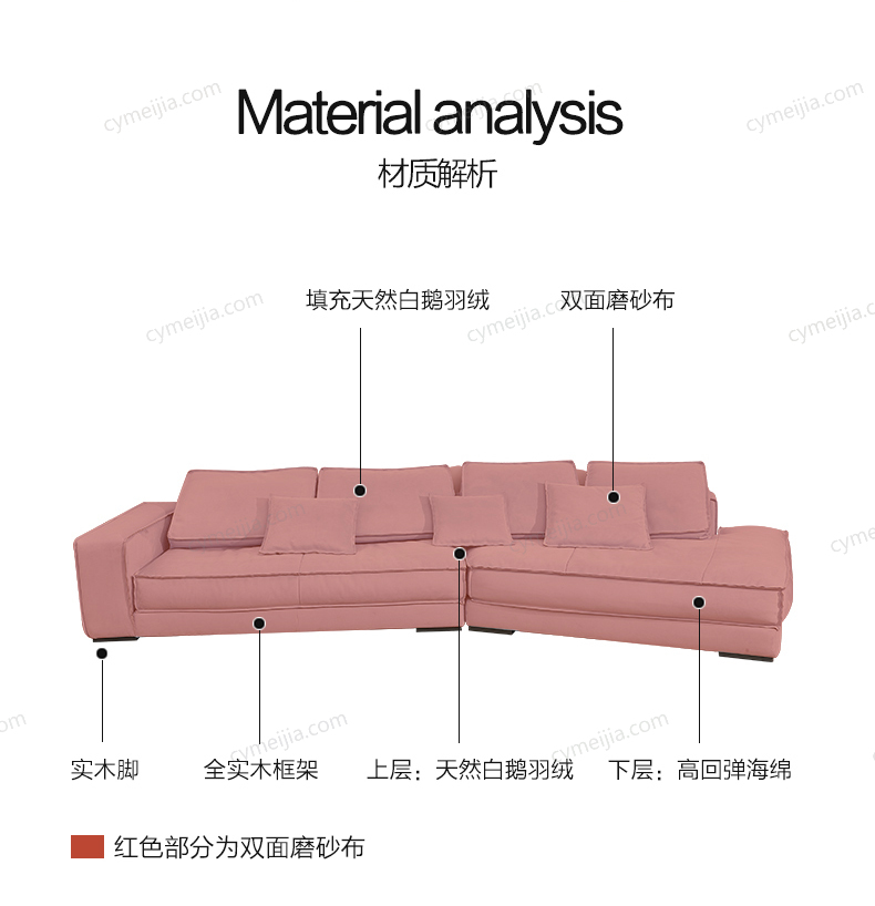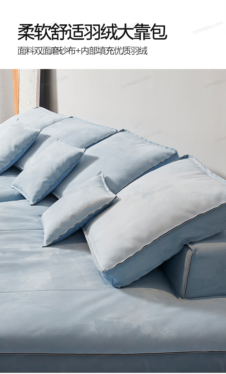 | 产品材质 : | 进口优质双面磨砂布+羽绒+高密度海绵+俄罗斯落叶松实木框架 |