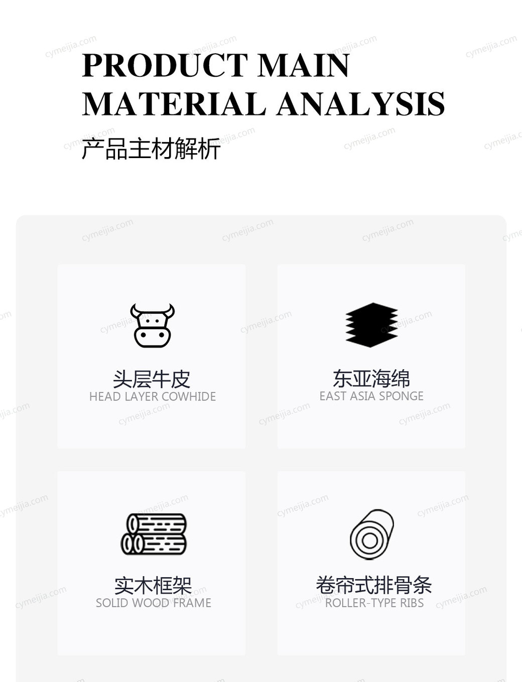 | 产品材质 : | TE进口头层黄牛皮+环保皮+俄罗斯进口云杉木+东亚海绵 |