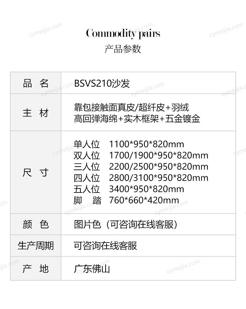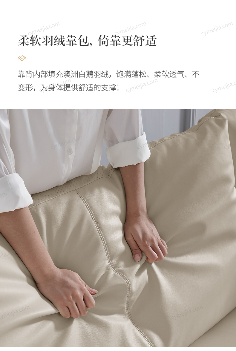 | 产品材质 : | 接触面进口头层黄牛皮+羽绒+高密度海绵+俄罗斯落叶松实木框架+五金镀金脚 |