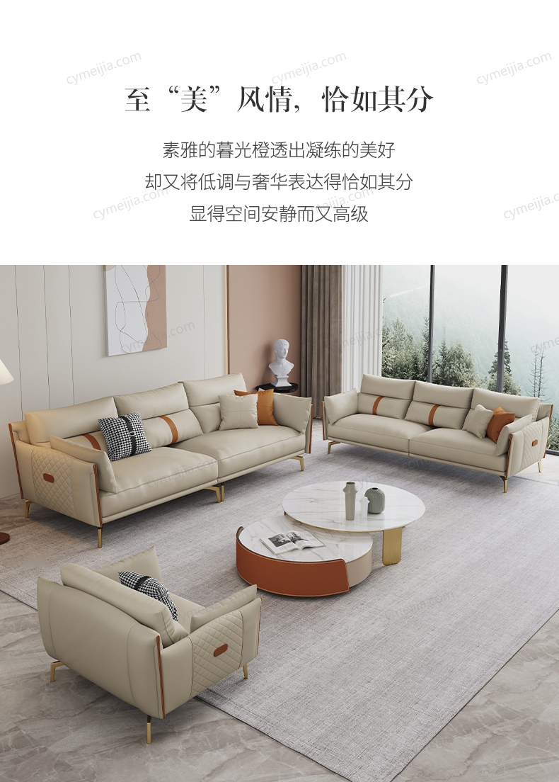 | 产品材质 : | 接触面进口头层黄牛皮+羽绒+高密度海绵+俄罗斯落叶松实木框架+五金镀金脚 |