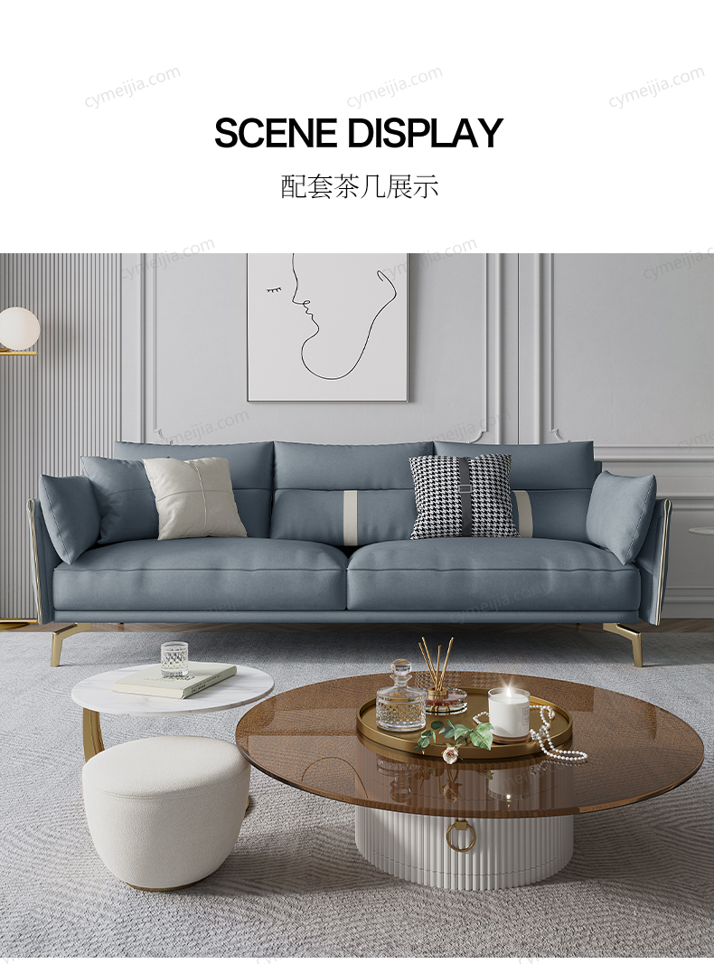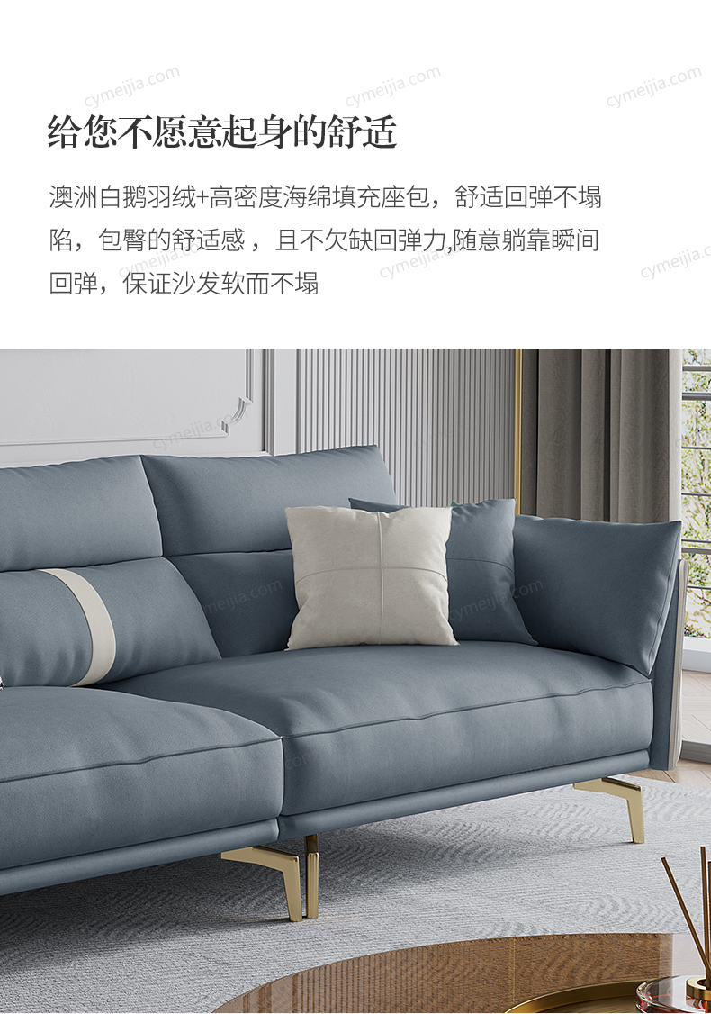 | 产品材质 : | 科技布+羽绒+高密度海绵+俄罗斯落叶松实木框架+五金镀金脚 |
