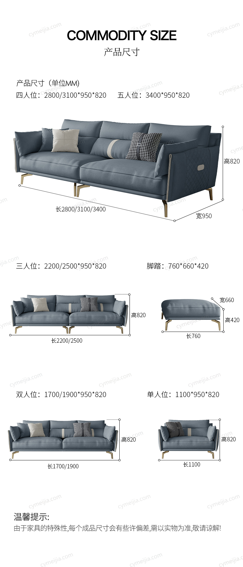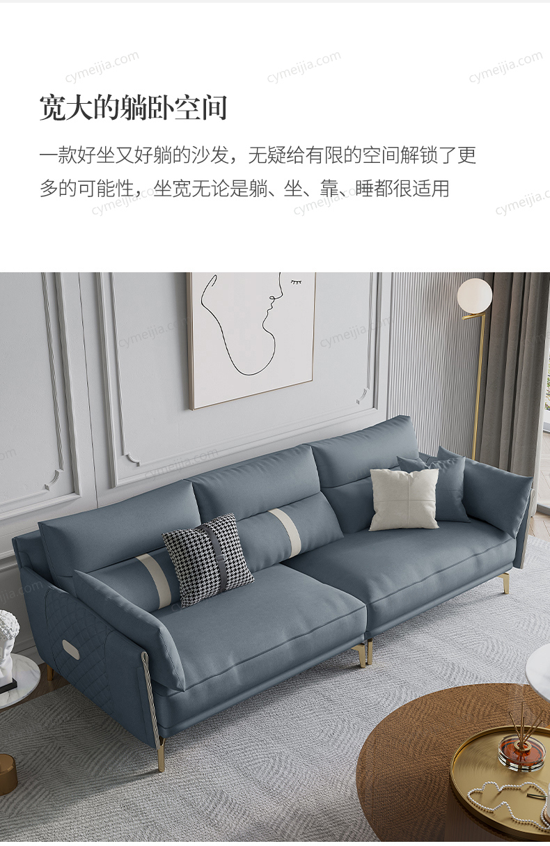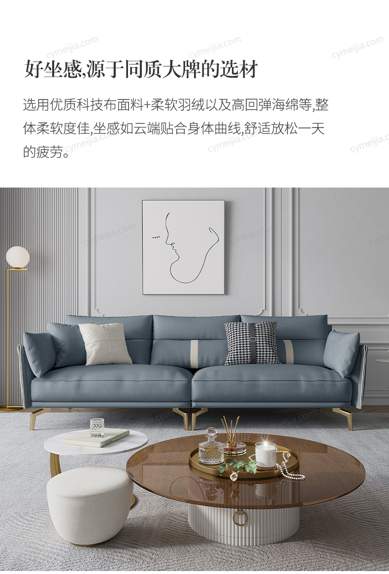 | 产品材质 : | 科技布+高密度海绵+俄罗斯落叶松实木框架+五金镀金脚 |