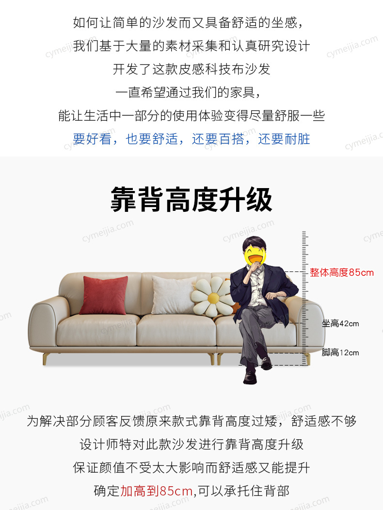 | 产品材质 : | 纳米科技布+高密度海绵+俄罗斯落叶松实木框架+五金脚 |