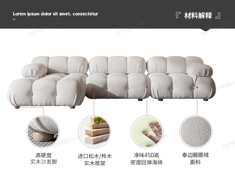 | 产品材质 : | 泰迪圈圈绒+一体发泡定型棉+高密度海绵+俄罗斯落叶松实木框架 |