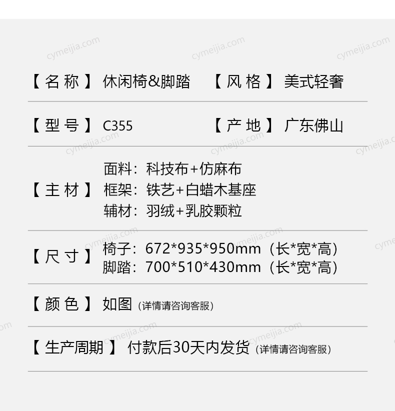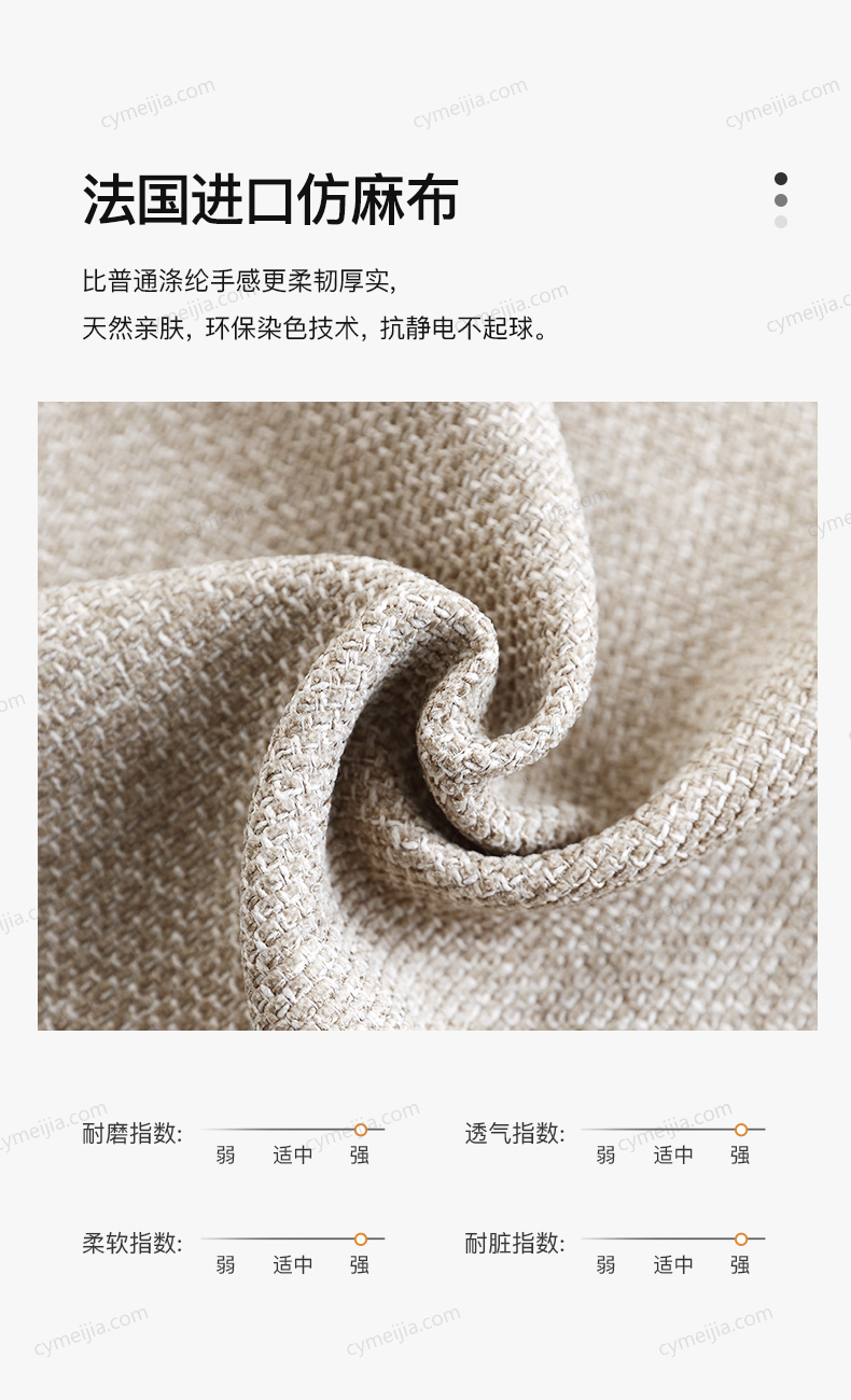 | 产品材质 : | 科技布+仿麻布实木弯板结构+全密度海绵+活动包羽绒+公仔棉 |