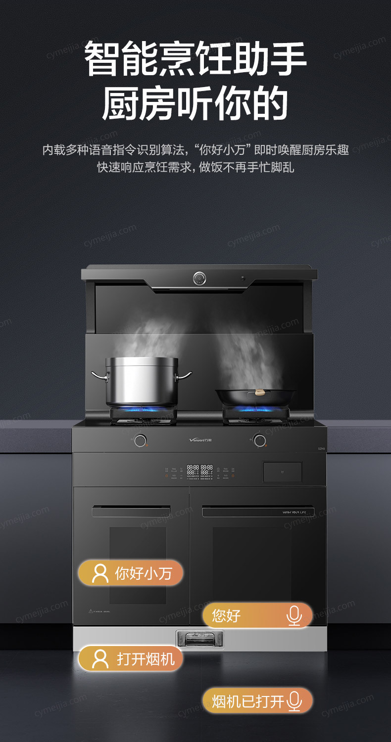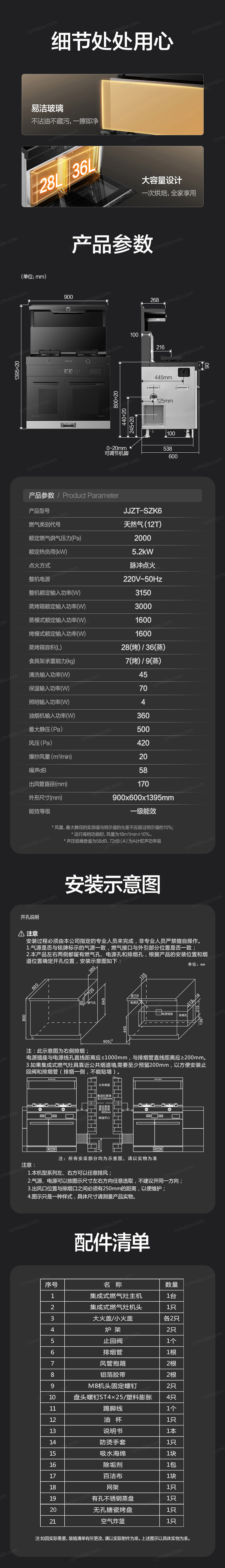 | 包件数 : 1 | 产地 : 广州 | 产品功能 : 1)蒸烤炸双腔;2)5.2kW大火力,搭载鼓风燃烧技术,让您的烹饪更加迅猛;3)拥有语音交互功能,解放双手同时提升厨房科技感;空气炸和制干果功能,口油低脂口感好,满足全家老小日常所需;4)拥有双灶独立定时功能,无需等待,到点自动关火;导烟板采用纳米易洁涂层材质,一抹即净;5)烤炸箱采用搪瓷陶晶内胆,耐高温耐腐蚀,不沾油污,一抹即净;气电分离技术,注重产品的安全性能,保障使用安全;6)20m3/min风量、500Pa强压技术,瞬吸秒排;7)头部带有MAX暖餐吧,空间利用率更高,实现饭菜长效保温;8)高温热干洗技术,一键自清洁;9)双重防火墙设计,能够及时检测燃气泄漏并发出警报; | |