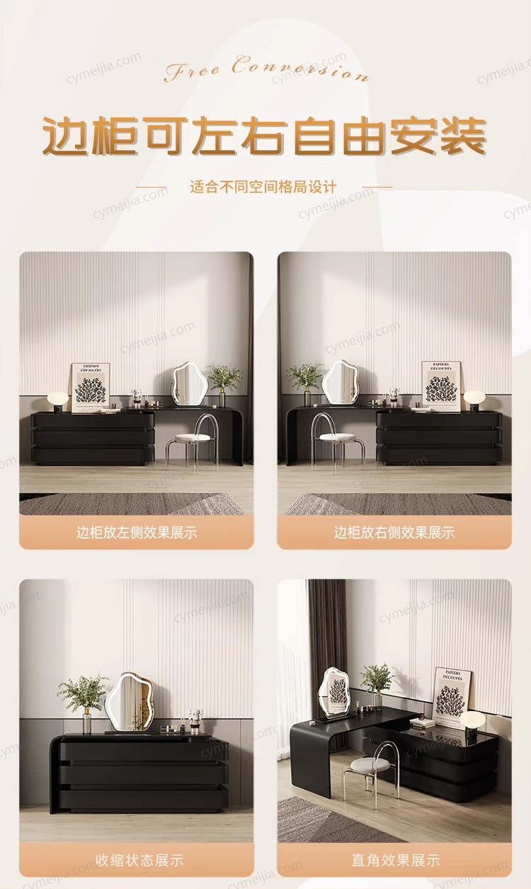 | 规格 : 妆柜:长1300*宽400*高690mm;妆台:长1200*宽400*高750mm | 发货周期 : 25-30天内 | 产品材质 : 实木多层板+金属烤漆 | |